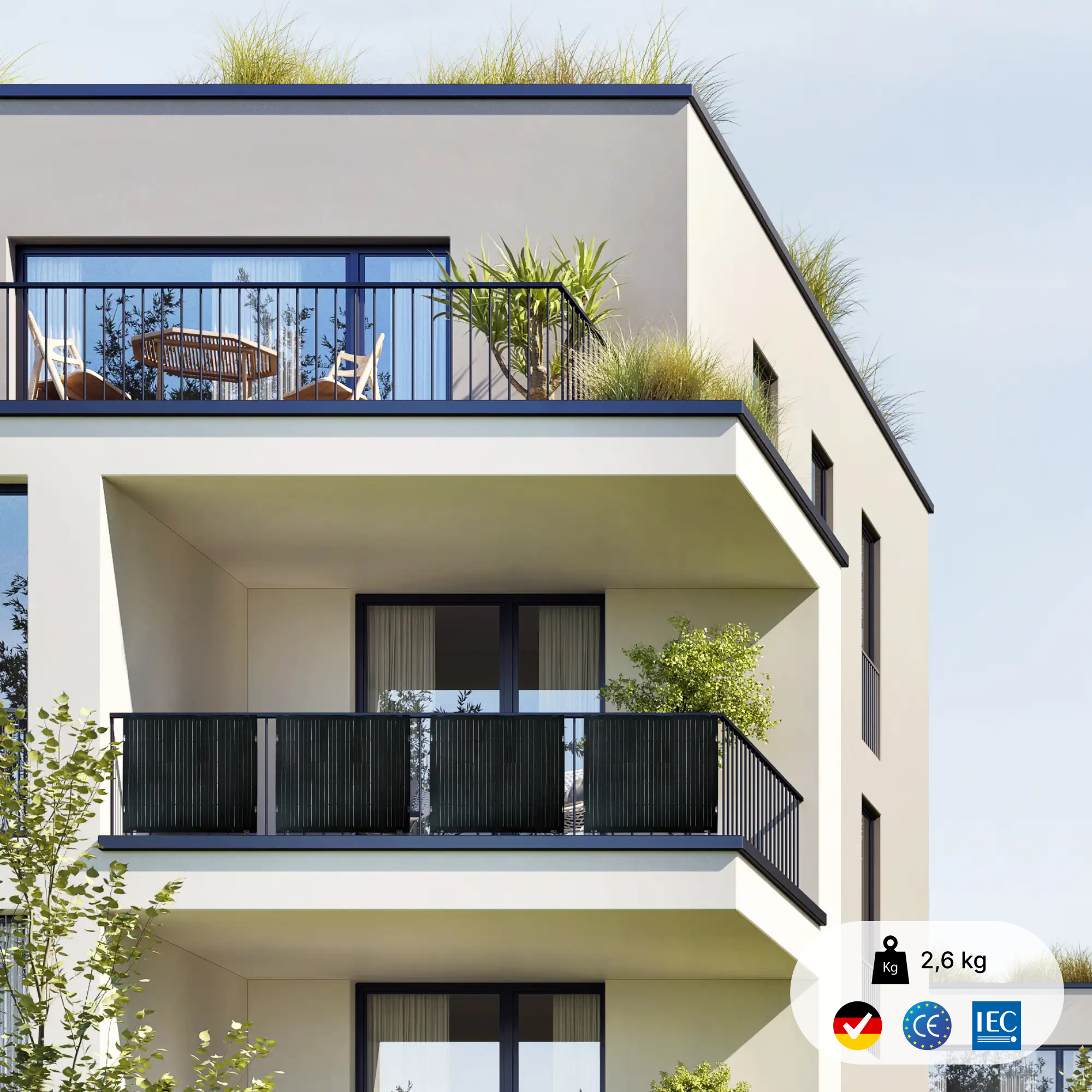 Ultraleichtes 600 Watt Balkonkraftwerk Set (pro Paneel nur 2,6 kg) für den Balkon.