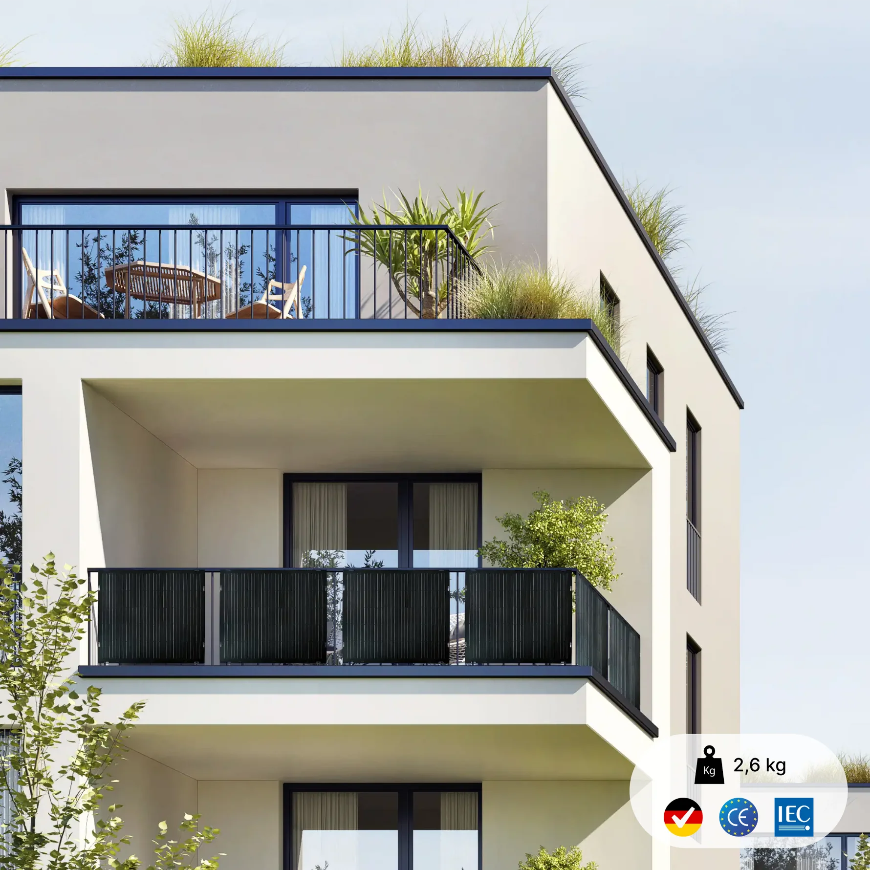 Ultraleichtes 900 Watt Balkonkraftwerk Set (pro Paneel nur 2,6 kg) für den Balkon.